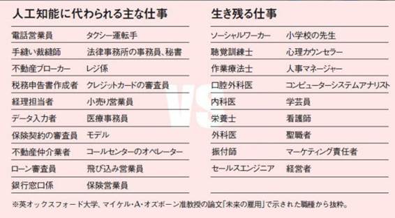 最近、車の自動運転を各社が積極的に開発して、2020年には実用化されると聞く。人工知能の発達は素晴らしいもので、人々の生活を豊かにしてくれるものと、ますます期待されている。しかし、一方、人工知能の発展に伴い、10年後には人間の仕事がなくなるとの記事も出ている。英オックスフォード大学のマイケル・A・オズボーン准教授が人口知能の発達で今後置き換えられる職種はどんなものがあるかと試算した結果、医師や小学校の先生は残るが、電話営業やタクシー運転手などは人工知能に代替されるという。単純作業はロボットなどの人工知能に置き換わり、人間に残る作業は創造的な知的作業に限られ、労働市場の大きな変化が進みつつあると警鐘を鳴らしている。